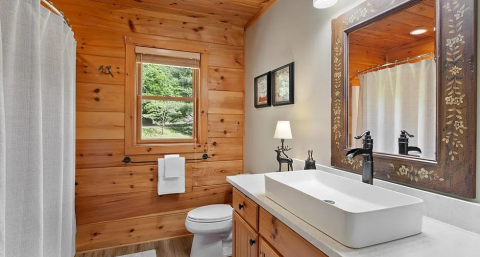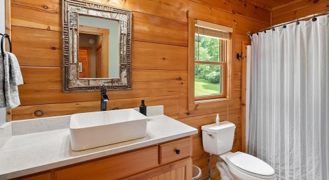 Fully furnished 2-bedroom with walk-in closets, 2 full bathroom cabin with a view of the pond and stream. Covered front and back porch with a fire pit on 1.8 acres in Vilas, NC.
