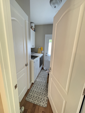 The home also includes a separate laundry room with a washer and dryer, a fenced-in backyard, a flat driveway with plenty of parking, and a small side deck for enjoying the outdoors.