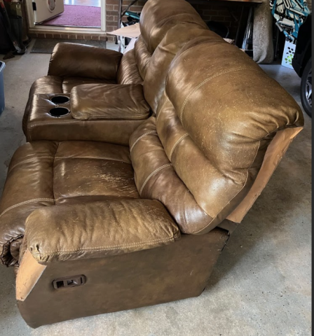 Free leather reclining loveseat. Has some wear and tear and cat scratches, but the recliners are functional.